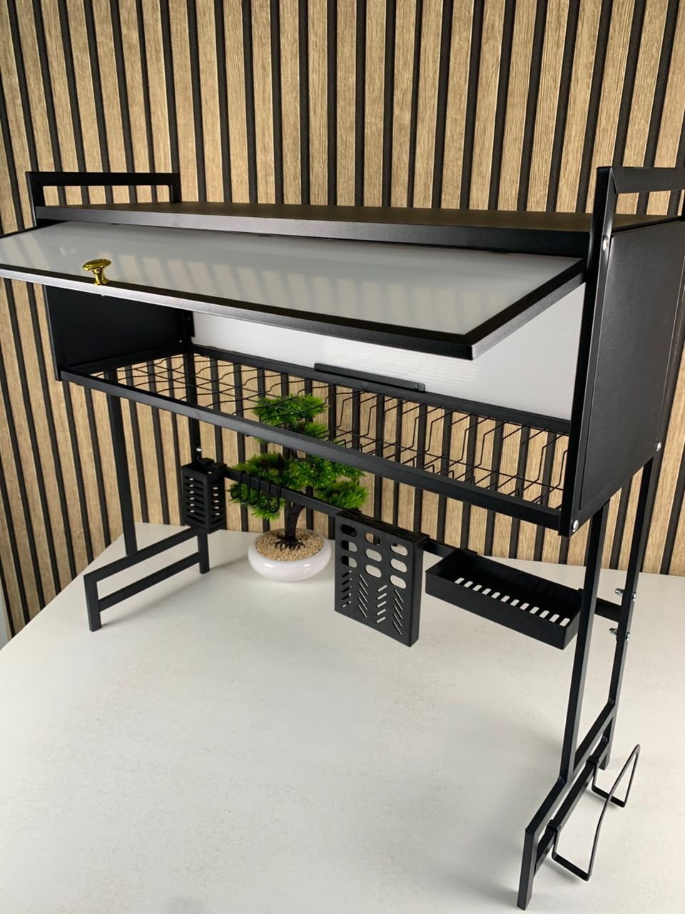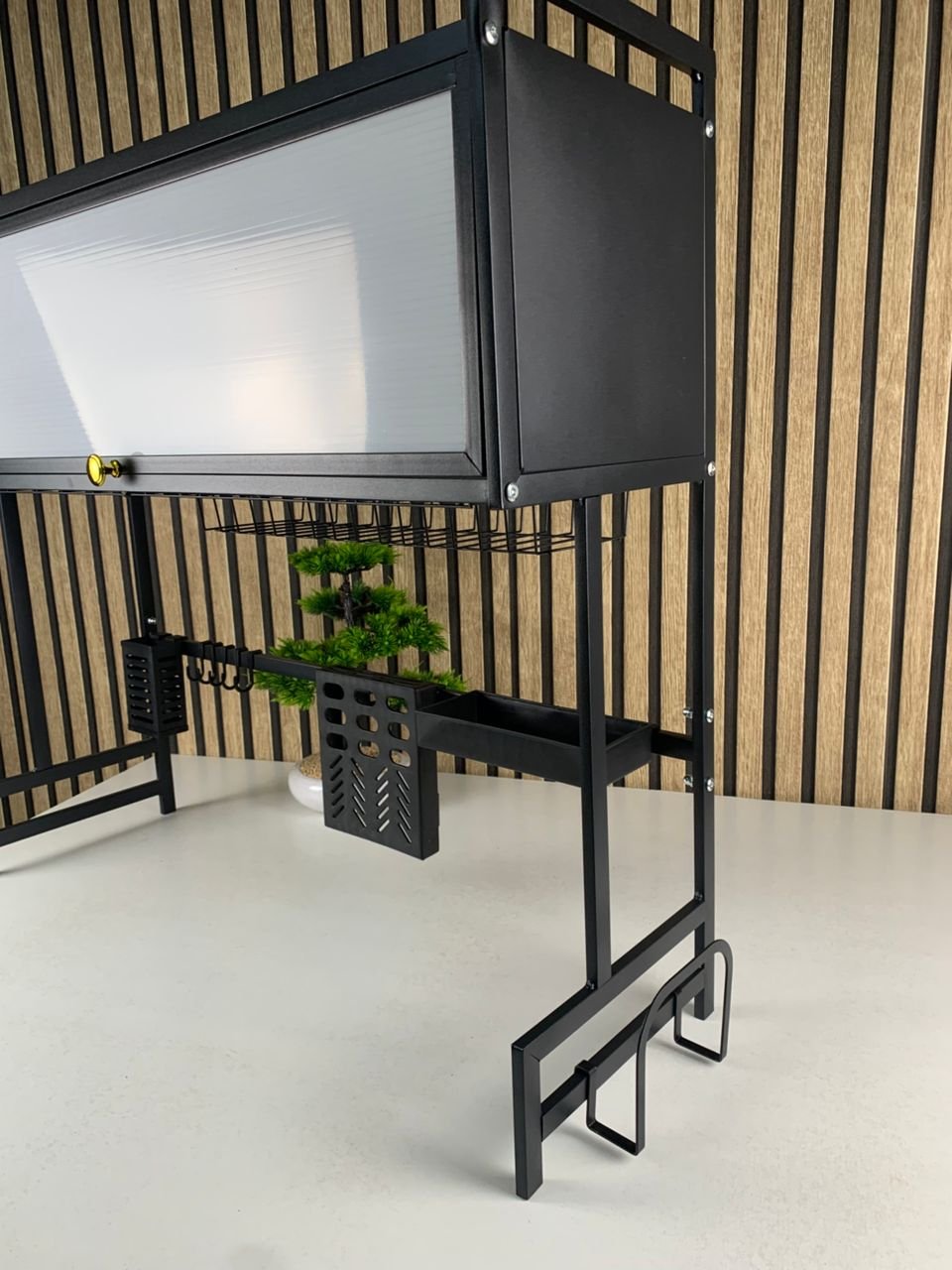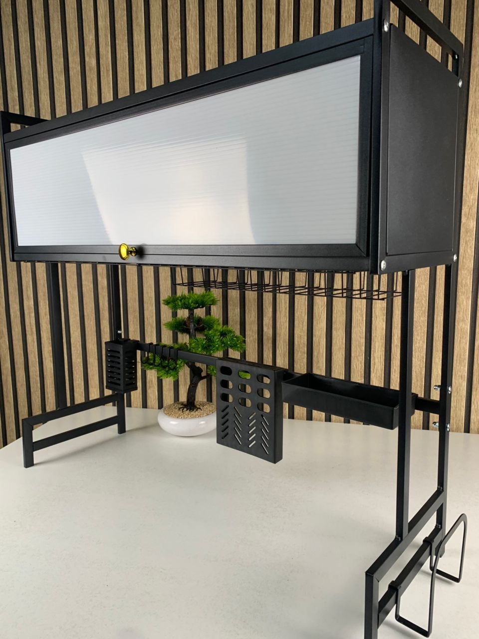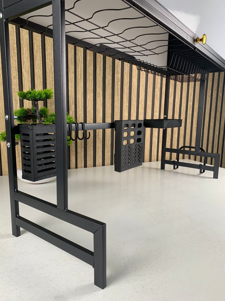 Fabriqué en acier inoxydable de haute qualité avec un revêtement noir mat, il allie robustesse et résistance à la rouille pour un usage durable. Sa conception ingénieuse inclut une sangle de rangement, un support pour couteaux, un support pour planche à découper, un porte‑couverts et 6 crochets, assurant un plan de travail propre et organisé à tout moment.