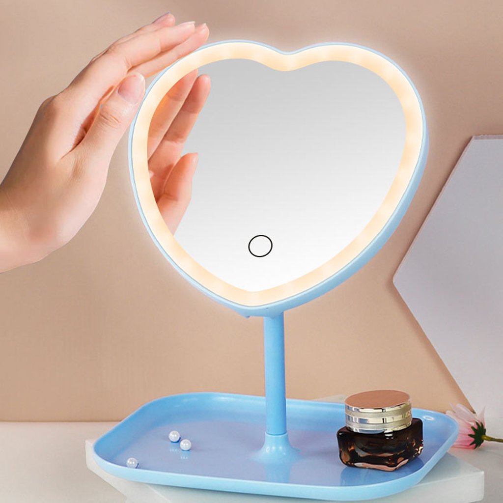 Miroir de Maquillage LED Cœur – Haute Définition, Plateau Rangement & USB Rechargeable